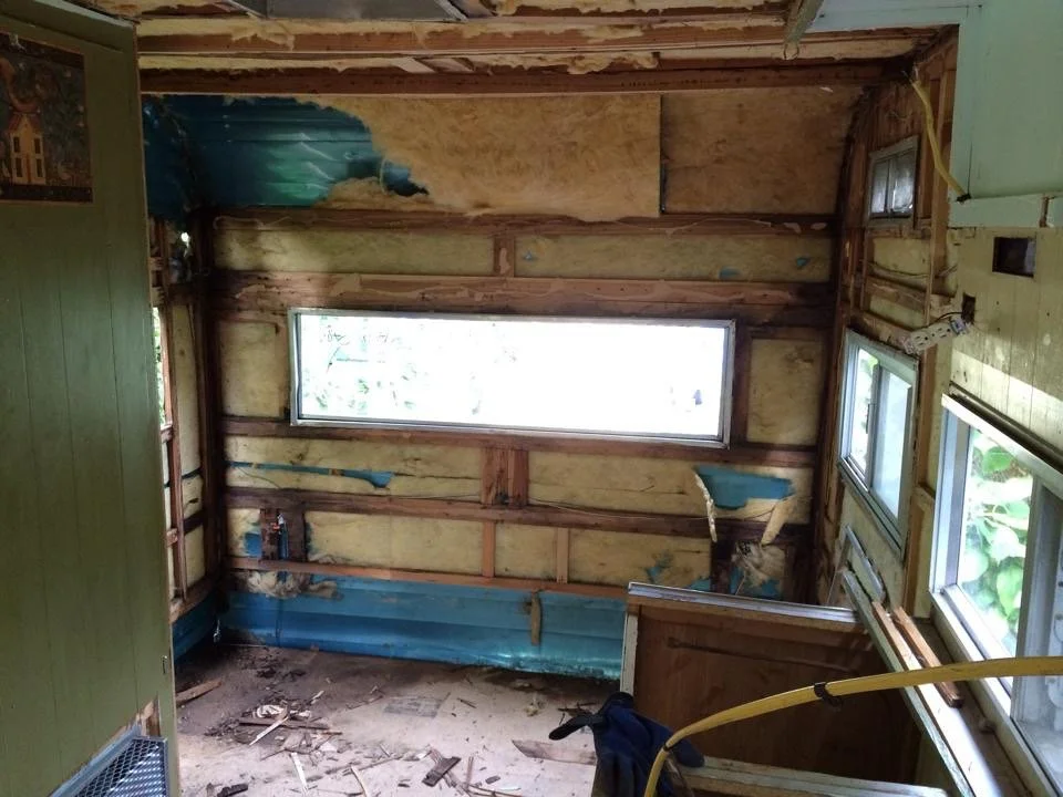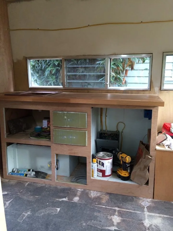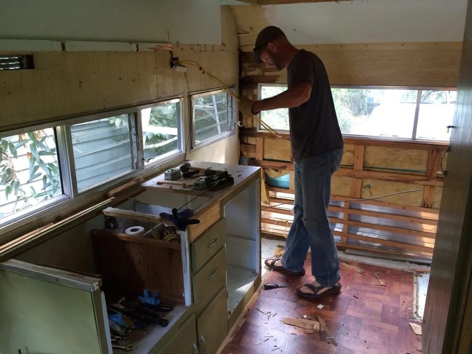 my partner and I stripped out the interior, keeping parts of the original to renovate and use later (fun fact, the ‘furniture’ in a camper like this forms some of its structural integrity; take it out and you might have it collapsing around you if you try to move it).