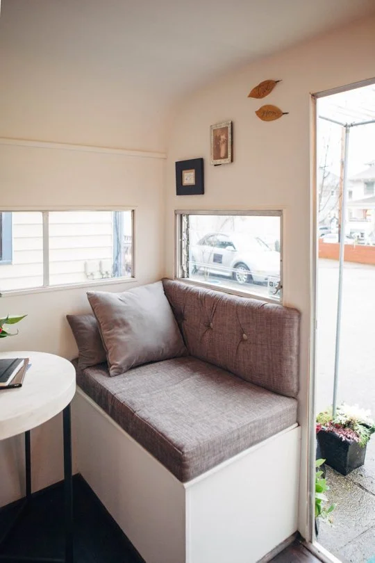 then we insulated it as well as we could manage in the little space, built a walk in refrigerator (for the flowers) at one end, replaced the drip rail on the exterior, took out the windows, cleaned and reinstalled them and then painted and finished it to be the cute little flower shop of my dreams.